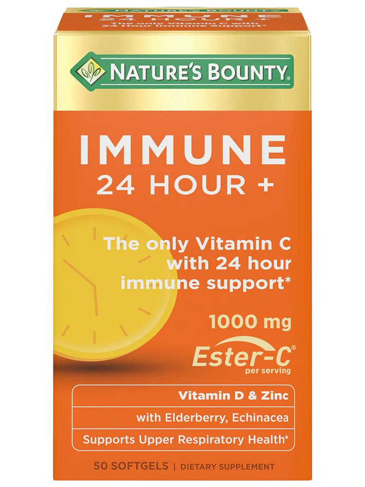 Nature’s Bounty® Immune 24 Hour + with Ester-C ®, the only Vitamin C with 24 hour immune support.* Every dose of Immune 24 Hour+ provides advanced, long-lasting immune support to help keep you healthy.* Clinically studied Ester-C is the only Vitamin C that stays in your white blood cells for up to 24 hours and lasts up to 2x longer than regular Vitamin C. * Highly bioavailable Ester-C® can increase Vitamin C levels in the body, which is important for white blood cell function, as white blood cells play a vital role in the immune system and contribute to the health of the upper respiratory tract.* These rapid release softgels contain Vitamin D , Zinc and Vitamin A for extra immune and antioxidant support.* Plus, the immune-supporting formula* is Non-GMO, and free of artificial flavors, sweeteners, sugar, starch, milk, lactose, soy, gluten, wheat, yeast, fish, and sodium. Immune 24 Hour + also includes ingredients Elderberry and Echinacea for added benefits, plus 9 essential nutrients to support your overall health.*